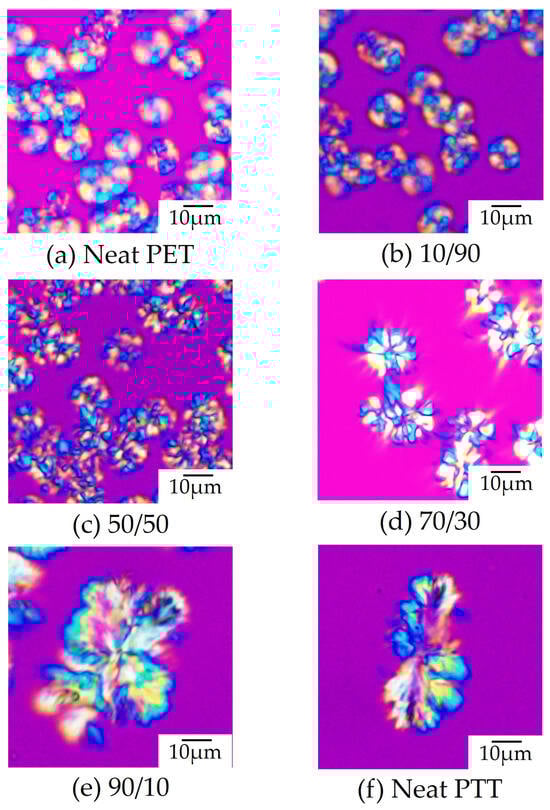 Figure 1 shows the spherulite morphology of poly(trimethylene terephthalate) (PTT)/poly(ethylene terephthalate) (PET) blends of different contents, as observed using polarized optical microscopy during isothermal melt crystallization at 215 °C, in which both PTT and PET can crystallize, and the crystallization rate of PET is faster than that of PTT. The spherulite morphologies of the neat PET and neat PTT are also shown for comparison. Compact spherulites with yellow and blue interference colors were formed in the neat PET due to the radial arrangement of the crystallites (Figure 1a), while large dendritic spherulites consisting of thick fibrils with a large cross-section several micrometers in size were formed in the neat PTT (Figure 1f). Compact spherulites observed in the neat PET were formed in the 20/80 and 50/50 PTT/PET blends (Figure 1b,c), while dendritic spherulites observed in the neat PTT were formed in the 80/20 blend (Figure 1e). In the 70/30 PTT/PET blend, both compact spherulites and dendritic spherulites were observed, indicating that PET spherulites and PTT spherulites can coexist (Figure 1d). These results indicate that PET spherulites grew in the blends with a PTT content of less than 90 wt%, while PTT spherulites grew in the blends with a PTT content of 70 wt% or more.