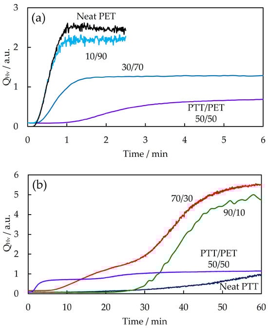 Time evolution of the integrated Hv light-scattering intensity, QHv, for PTT/PET blends with different contents during isothermal melt crystallization at 215 °C: (a) 0/100–50/50 PTT/PET, (b) 50/50–100/0 PTT/PET.