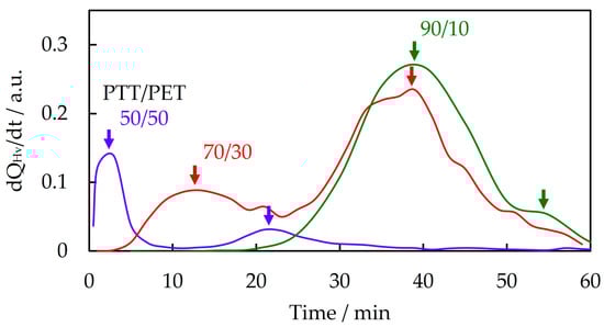Time evolution of the derivative of QHv, dQHv/dt, for PTT/PET blends with different contents during isothermal melt crystallization at 215 °C. The peak is indicated by the arrow.
