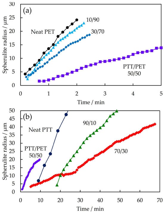 Time variation of the spherulite radius for PTT/PET blends of different contents during isothermal melt crystallization at 215 °C: (a) 0/100–50/50 PTT/PET, (b) 50/50–100/0 PTT/PET.