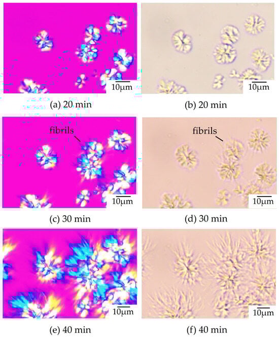 Morphology evolution of 70/30 PTT/PET during isothermal melt crystallization at 215 °C, observed with polarized optical microscopy (a,c,e) and optical microscopy (b,d,f).