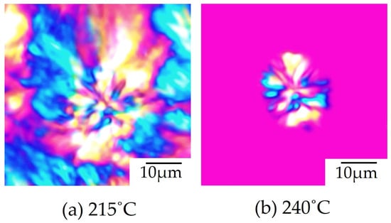 Spherical growth during isothermal melt crystallization was observed using an Olympus BX53 polarizing optical microscope (Olympus Corp., Tokyo, Japan) equipped with a sensitive tint plate (optical path difference of 530 nm) and an Olympus DP74 digital camera (Olympus Corp., Tokyo, Japan). For isothermal melt crystallization, the film specimen was annealed at the desired crystallization temperature on a Mettler Toledo HS82 hot stage (Mettler Toledo, Columbus, OH, USA) mounted on the stage of the polarizing optical microscope. The changes in the morphology of the melt-crystallized specimen after heating were also observed with the polarizing optical microscope described above. The spherulite morphology was also observed with the optical microscope without crossed polarizers.
