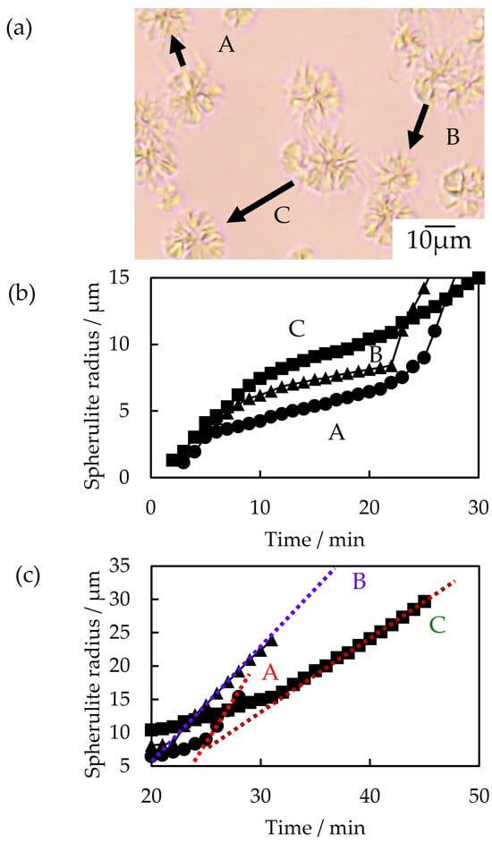 As shown in Figure 7, the spherulite growth of 70/30 PTT/PET shown in Figure 4b varied with interspherulite distance. The spherulite growth rate of PET decreased in the first crystallization step at a shorter interspherulite distance, with the decrease becoming larger as the interspherulite distance became shorter. The spherulites, in order of shortest to longest, were A, B, and C (Figure 7a,b). The decrease in the growth rate is attributed to the interference of the PTT excluded in the interspherulite melt region between the PET spherulites, as has been reported for polypropylene/liquid paraffin blends [26]. As the interspherulite distance became shorter, the PTT concentration at the spherulite growth front of PET became higher, and the spherulite growth rate of PTT in the second crystallization step was faster, i.e., the spherulite growth rate in the second crystallization step for spherulites A, B, and C, as determined from the slope in Figure 7c, were 2.1, 1.7, and 1.0 μm/min, respectively. Thus, the spherulite growth in the second crystallization step was caused by the PTT being excluded from the growth front of PET in the first crystallization step.