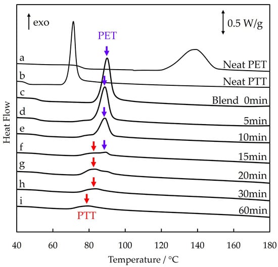 Figure 8 shows the differential scanning calorimetry (DSC) thermograms for the heating process of 70/30 PTT/PET during isothermal melt crystallization at 215 °C for different crystallization times. The DSC thermograms of neat PET and neat PTT are also shown for comparison. The crystallization temperatures of neat PET and neat PTT during the heating process were 140 °C and 70 °C, respectively (Figure 8a and b). In the blend, an exothermic peak appeared at about 90 °C. This peak is attributed to the crystallization of PET. The shift of the peak to a lower temperature could be attributed to the accelerated crystallization induced by liquid–liquid phase separation during the heating process due to the existence of an upper critical solution-type phase diagram [50]. The area of the peak at about 90 °C decreased with time during crystallization as a result of the decrease in the crystallizable amorphous region of PET, which was due to the spherulite growth of PET in the first crystallization step (Figure 8c–f). After 15 min of crystallization, an exothermic peak appeared at about 80 °C (Figure 8f). This peak is attributed to the crystallization of PTT. The shift of the peak to a higher temperature could be attributed to the delay in crystallization due to the presence of PET in the excluded PTT, i.e., the excluded PTT on the outside of the PET spherulite was not pure PTT but mixed with PET. As a result of the presence of PET in the excluded PTT, the dendritic spherulite in the blend was more open than that of the neat PTT (Figure 1 and Figure 5), which was due to the exclusion of PET from the spherulite growth front of PTT in the second crystallization step. The area of the peak at around 80 °C during the crystallization of PTT decreased with crystallization time as a result of the decrease in the crystallizable amorphous region of PTT, which was due to the spherulite growth of PTT in the second crystallization step (Figure 8g–i). This result supports the crystallization of the excluded PTT in the second crystallization step.