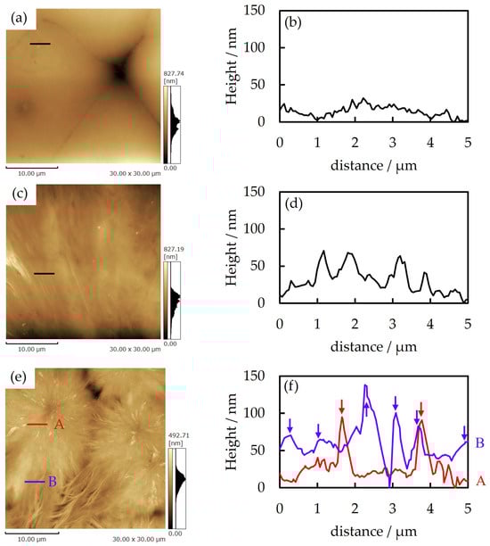 AFM height images and height profiles of neat PET, neat PTT, and 70/30 PTT/PET obtained through isothermal melt crystallization at 215 °C: (a,b) neat PET, (c,d) neat PTT, and (e,f) 70/30 PTT/PET. The arrow in (f) indicates the PTT fibril.