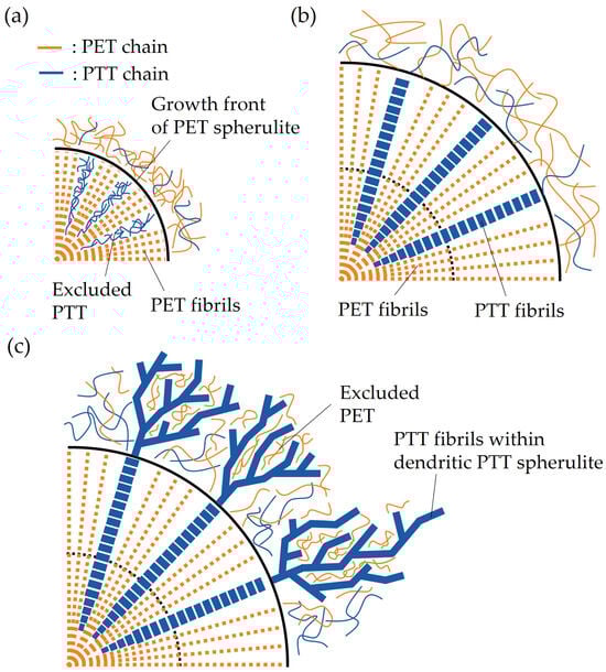 Figure 10 schematically shows the evolution of a double spherulite obtained through two-step crystallization in 70/30 PTT/PET during isothermal melt crystallization at 215 °C. The PET spherulite grew from the miscible melt of PTT and PET in the first crystallization step. During the spherulite growth of PET, PTT mixed with PET was excluded from the growth front of PET into the interfibrillar amorphous region within the PET spherulite (Figure 10a). The excluded PTT in the interfibrillar amorphous region crystallized and grew into long fibrils in the radial direction within the PET spherulite (Figure 10b). This reflects the interfiling crystallization of PTT in the confined interfibrillar amorphous region within the PET spherulite. The spherulite growth rate of PET gradually decreased as the concentration of the PTT at the growth front of PET increased. When the growth of the PET spherulite stopped, the PTT fibrils interfiled within the PET spherulite emerged from the growth front of the PET spherulite and continuously grew outward into the outer region to form a dendritic spherulite in the second crystallization step (Figure 10c). Due to the exclusion of PET into the interfibrillar amorphous region of PTT, the dendritic PTT spherulite was more open than that of the neat PTT. The characteristic two-step spherulite growth and the double spherulite formation are attributed to the following: (1) the exclusion of PTT into the interfibrillar amorphous region of PET during the spherulite growth of PET and interfiling crystallization of PTT in the confined interfibrillar amorphous region, which grew into fibrils in the radial direction within the PET spherulite; (2) the cessation of the spherulite growth of the PET due to the PTT being excluded at the spherulite growth front of PET; and (3) the continuous growth of the radially arranged PTT fibrils from inside the PET spherulite to outside the growth front of the PET spherulite to form the dendritic PTT spherulite.