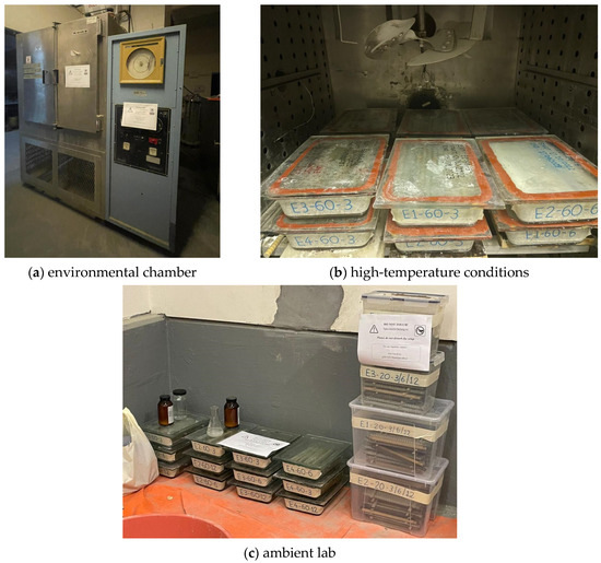 GFRP bar specimens were cut into lengths of 300 mm, end-coated with epoxy resin, and placed in containers. The containers were then filled with one of the conditioning solutions—C1, C2, C3, or C4—and sealed with silicone to inhibit moisture loss. The containers were then placed in the environmental chamber shown in Figure 3a for high-temperature exposure (Figure 3b) or under standard laboratory conditions (Figure 3c).