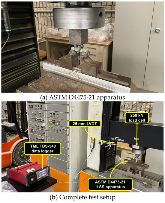 where S is the strength of the short beam (MPa), P is the failure load (N), and d represents the specimen diameter (mm). In this study, displacement-controlled loads were applied at a rate of 1 mm/min. A 250 kN-capacity load cell and a linear variable differential transducer (LVDT) were simultaneously recorded in a data logger, as shown in Figure 4b.