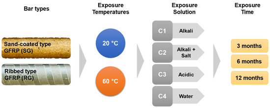 D’Antino et al. [18] studied the durability of thermoset (6, 20, and 32 mm diameters) and thermoplastic (6, 12, and 25 mm diameters) GFRP bars in an alkaline solution with pH 13 at 60 °C for up to 1000 h using tensile and short-beam shear tests. The tensile strength and elastic modulus of the thermoset bars decreased by 13.5% and 6.1%, respectively, whereas those of the thermoplastic bars exhibited maximum reductions of 12.4% and 8.3%, respectively. The SBSS was minimally affected, except for the bars with the smallest diameters, which showed significant reductions.