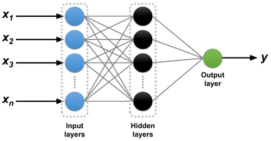 ANNs, computational models inspired by the structure of the human brain by mimicking its interconnected neurons, are primarily used in applications involving ML and artificial intelligence (AI) [21,38]. ANNs typically consist of interconnected layers of units (known as “neurons”), which collaboratively process data, recognize patterns, make decisions, and generate predictions. As shown in Figure 6, a standard ANN architecture includes an input layer, one or more hidden layers, and an output layer. Each neuron in a given layer connects to the neurons in the next layer [39]. Each connection carries a weight that adapts as the network learns from data.
