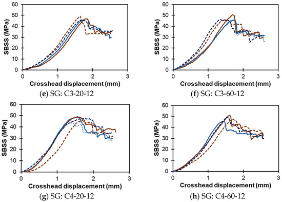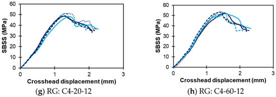 The load–displacement curves of typical control specimens of sand-coated SG and ribbed-type RG GFRP bars are plotted in Figure 7a,b, respectively. The sand-coated SG bars exhibit an average peak SBSS of 47.6 ± 1.2 MPa. The SBSS–displacement curves in the SG bars show an initial sharp rise, representing elastic deformation, followed by a peak between 40 and 50 MPa, before gradually declining with fluctuations, likely due to microcracking. The ribbed-type RG bars exhibit a mean SBSS of 53.6 ± 1.7 MPa. The SBSS–displacement response curves initially showed a sharp increase in strength with displacement, indicating elastic deformation, followed by a peak between 50 and 60 MPa. After the peak, the SBSS decreased with displacement.