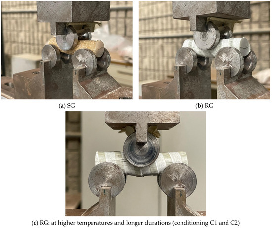Strength degradation in GFRP bars is largely influenced by high temperature and alkaline exposure. The glass transition temperature (Tg) of the polymeric resin matrix, i.e., the point at which the resin softens, weakening the composite bond between glass fibers and the matrix, occurs between 100 and 120 °C [7]. The softening of the polymeric resin results in a viscoelastic transition that causes partially irreversible thermal damage to the matrix. The short-beam shear strength (SBSS), as per ASTM D4475-21 [8], is a vital property for evaluating the quality and performance of GFRP bars as it measures the strength of the bond between the polymeric resin matrix and glass fibers, which directly impacts the composite’s ability to withstand stress without separation. For quality control, SBSS tests provide insights into the consistency of composite materials, enabling manufacturers to identify and rectify variations in production that could lead to premature failures [6,8,9].