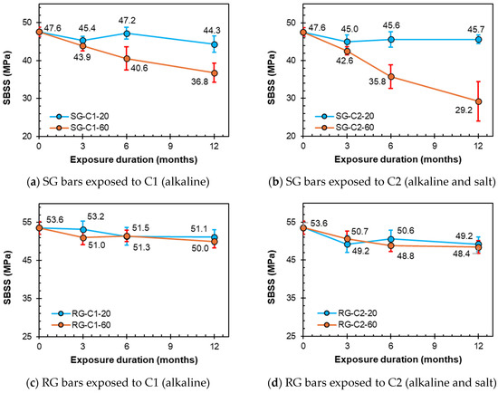 The ribbed RG bars exhibited reductions of 4.5% and 8.2% in C1 and C2, respectively, after 12 months (Figure 11c,d). However, RG exhibited better SBSS retention compared to SG at high-temperature conditions at 60 °C. In C1 and C2 at 12 months, the RG showed only 6.6% and 9.6% reductions in the SBSS, respectively.