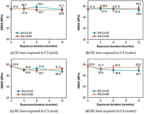 The effects of the conditioning solutions C3 (acidic) and C4 (water) on the SG and RG bars are shown in Figure 12. The evolution of the SBSS of the sand-coated SG bars for various conditioning durations (3, 6, and 12 months) in C3 and C4 is shown in Figure 12a,b, respectively. Under laboratory conditions at 12 months, the bars demonstrated low SBSS reductions of 1.0% and 1.5% at C3 and C4, respectively. Unlike C1 and C2, C3 and C4 caused a minimal SBSS reduction of 1.7% in C3 and a mild increase of 1.3% in C4 after 12 months.
