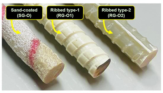 This study investigated the effects of various accelerated aging conditions on two types of new-generation GFRP bars. Older-generation bars exposed to similar conditions were compared to gain further insights. Accordingly, this study compared the SBSS results with the findings from a previous investigation, which evaluated the SBSS retention of three types of GFRP bars manufactured more than 20 years ago [9,33]. In the research work by Fasil and Al-Zahrani [9], three GFRP bar types, ribbed-type 1 (RG-O1), ribbed-type 2 (RG-O2), and sand-coated (SG-O) GFRP bars, were exposed to four conditions—alkaline, alkaline and salt, acidic, and water—and two temperature regimes—laboratory ambient and high temperature—for up to 12 months. Figure 13 illustrates the surface textures of the SG-O, RG-O1, and RG-O2 bars. The properties of these older-generation GFRP bars, such as their diameter, glass fiber type, matrix type, and transverse shear strength, are summarized in Table 3.