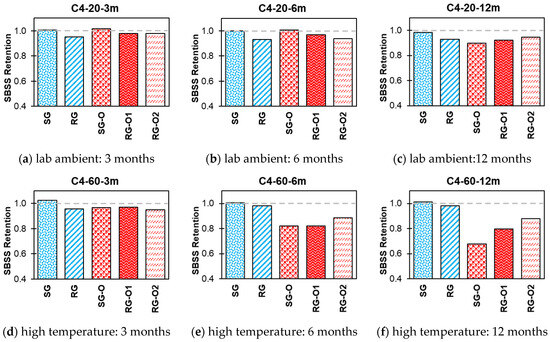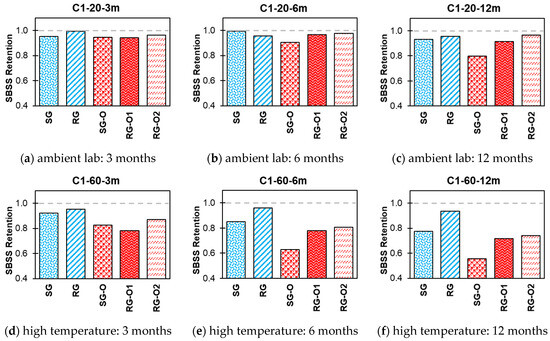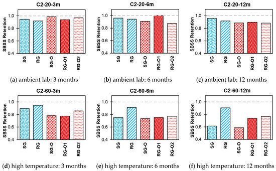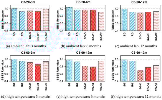 In C3 at 20 °C (Figure 16), the SG bar showed a slight increase, with values exceeding 100% (1.01 and 1.04) after 3 and 6 months and stabilizing at 99% after 12 months. The RG, SG-O, RG-O1, and RG-O2 bars also retained 89–92% of their SBSS values after 12 months. At 60 °C, SBSS retention declined over time, particularly for the older-generation bars. By 12 months, while the SG and RG bars retained 98% and 96% of their initial SBSS values, respectively, the older-generation bars showed greater reductions, with SG-O at 69%, RG-O1 at 78%, and RG-O2 at 83% after 12 months of conditioning.