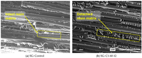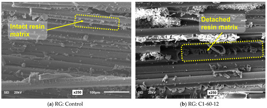 The microstructural analyses of the two types of GFRP bar specimens were conducted using SEM to evaluate the effect of prolonged alkaline exposure on the material’s fracture surface. Samples were obtained from the fracture surfaces following the SBSS testing to validate the cause of degradation in their mechanical performance. Figure 18 and Figure 19 compare the SEM fractography to assess the effect of C1 on SG and RG bars, respectively. The control specimens of SG and RG, shown in Figure 18a and Figure 19a, respectively, exhibited relatively smooth fracture surfaces with minimal resin detachment and intact fiber-matrix adhesion. However, the SG and RG specimens that were exposed to the alkaline solution (C1) at 60 °C for one year, as shown in Figure 18b and Figure 19b, respectively, presented significant surface degradation, characterized by resin detachment and fiber exposure.