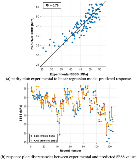 The parity plot in Figure 20a compares the experimental and predicted SBSS values obtained using the linear regression model. The model overestimates the SBSS values at lower strengths, particularly for values up to 40 MPa. The linear regression model achieved an R2 value of 0.76, indicating a relatively low reliability. The response plot in Figure 20b shows the variations between the experimental and predicted SBSS values for every input used in the model, highlighting discrepancies in the predictions.