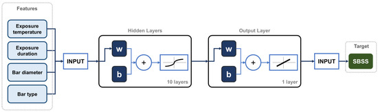 A dataset containing the SBSS test results for two types of new-generation GFRP bars (RG and SG) and three types of older-generation GFRP bars (RG-O1, RG-O2, and SG-O) under various exposure conditions was used to develop the linear regression and ANN models. Predictor variables included exposure types (C1, C2, C3, and C4), temperatures (20 °C and 60 °C), and bar types (SG, RG, SG-O, RG-O1, and RG-O2, SG-O) with respective diameters of 13.02, 13.71, 13.22, 13.04, and 13.02 mm. The response or target variable, the SBSS, ranged from 25.6 to 56.5 MPa. Categorical data such as exposure and bar type were represented using dummy variables (0 and 1). The coefficient of determination (R2) was used to evaluate the performance of both models, with higher R2 values (closer to 1) indicating better accuracy.