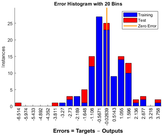 The ANN developed in this study, illustrated in Figure 21, is a two-layer feed-forward network with ten hidden neurons using a sigmoidal activation function and a single output layer with a linear transfer function. The ANN model’s performance, assessed through parity plots in Figure 22, shows an effective prediction of the SBSS for GFRP bars, with R2 values of 0.96, 0.90, and 0.95 for the training (Figure 22a), testing (Figure 22b), and total subsets (Figure 22c), respectively. A frequency histogram with 20 bins, shown in Figure 23, shows the error distribution between the experimental (target) and predicted SBSS values across the training, validation, and testing subsets.