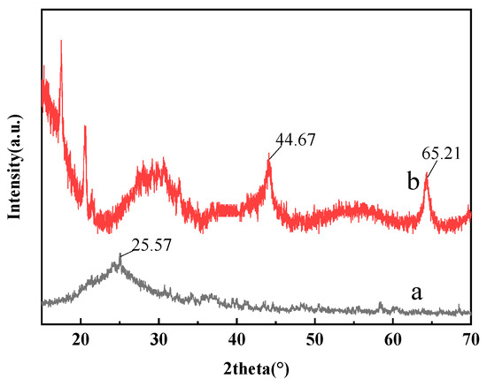 The XRD of the C60(OH)n and the C60(OH)n-Ag complexes are shown in Figure 2. The characteristic peak of C60(OH)n appears at 25.57 in Figure 2a [22], the characteristic peak of Ag occurs at 44.67° and 65.21° in Figure 2b [23]. After the formation of the C60(OH)n-Ag complex, a part of Ag entered the lattice of C60(OH)n and replaced C, resulting in the deformation of the C60(OH)n lattice. Therefore, the characteristic peak of the C60(OH)n-Ag complex was shifted (Figure 2b) [24], indicating that the C60(OH)n-Ag complex was synthesized.