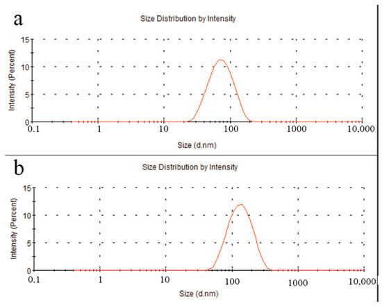 After ultrasonic treatment in solution, the particle size of C60(OH)n was around 78.1 nm (Figure 3a), while the particle size of the C60(OH)n-Ag complex was approximately 142 nm (Figure 3b). Both exhibited good dispersibility and uniform stability. Additionally, the increase in particle size indicated that Ag recombined successfully on the surface of C60(OH)n.