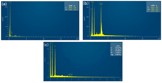 EDS of the modified C60(OH)n (a), C60(OH)n-Ag (b) and C60(OH)n-Ag/PVDF ultrafiltration membranes (c).