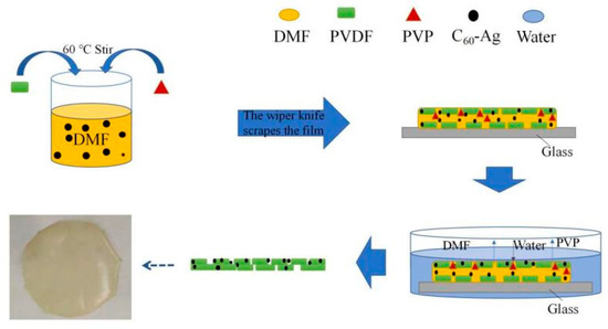 C60(OH)n or C60(OH)n-Ag was ultrasonically dispersed in dimethylformamide (DMF), and then polyvinylidene fluoride (PVDF) and polyvinylpyrrolidone (PVP) were added. The system was then heated and stirred until a transparent and uniform casting film liquid was formed, and the static defoaming was performed. The casting film liquid was cast on the glass plate; the scraping film process was performed by using a film scraper of 200 μm. The glass plate containing the casting film liquid was immersed in the water solidification bath. The shed membrane was soaked in distilled water for 24 h. The PVDF ultrafiltration membrane, C60(OH)n/PVDF ultrafiltration membrane and C60(OH)n-Ag/PVDF ultrafiltration membrane were, respectively, obtained.