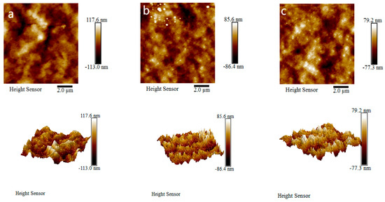 Roughness of the membrane surface is a key factor used to determine the anti-pollution performance of ultrafiltration membranes. If the roughness of the membrane surface is greater, more organic pollutants will be likely to accumulate in the depressions of the membrane surface [27,28,29]. AFM images of the PVDF ultrafiltration membrane, C60(OH)n/PVDF ultrafiltration membrane and C60(OH)n-Ag/PVDF ultrafiltration membrane are shown in Figure 8, and the detailed calculation results of the surface roughness parameters of the different ultrafiltration membranes are shown in Table 2. It can be seen from Figure 8 that the three ultrafiltration membranes all had characteristic peak–valley structures. Surface roughness values of the C60(OH)n/PVDF ultrafiltration membrane and the C60(OH)n-Ag/PVDF ultrafiltration membrane were, respectively, reduced by 8.1 nm and 10.1 nm in comparison with the PVDF ultrafiltration membrane, as shown in Table 2; the reductions in surface roughness in the PVDF ultrafiltration membrane modified by C60(OH)n or C60(OH)n-Ag were due to the movement of part of C60(OH)n or C60(OH)n-Ag to the surface of the ultrafiltration membrane during the phase conversion process.