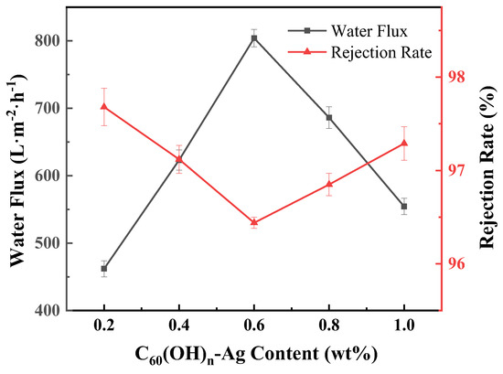 Effect of C60(OH)n-Ag content on water flux and rejection in the C60(OH)n-Ag/PVDF ultrafiltration membrane.