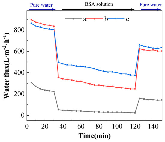 The changes in the permeability flux of different ultrafiltration membranes with time spent in the BSA solution cycling test are shown in Figure 11. From Figure 11, the permeation fluxes of the PVDF ultrafiltration membrane, C60(OH)n-Ag/PVDF ultrafiltration membrane and C60(OH)n-Ag/PVDF ultrafiltration membrane showed a trend of first decreasing and then stabilizing during the 90-minute filtration of the BSA solution. The permeation fluxes of the three ultrafiltration membranes were, respectively, stable at around 25.36 L·m−2·h−1, 247.70 L·m−2·h−1 and 377.45 L·m−2·h−1. Compared with the PVDF ultrafiltration membrane, the C60(OH)n-Ag/PVDF ultrafiltration membrane and the C60(OH)n-Ag/PVDF ultrafiltration membrane both had larger permeation fluxes after filtration for 90 min with the BSA solution. This is because the addition of C60(OH)n and C60(OH)n-Ag could improve the hydrophilicity of the membrane surface and promote the formation of a hydration layer on the membrane surface; thus, it was difficult for BSA molecules to enter the membrane pore and block the membrane pore. On the other hand, more finger-like pore structures were formed in the supporting layer, which could provide a greater permeability flux. In addition, the pure water flux of each ultrafiltration membrane after washing was not completely restored to the initial flux, which was due to the inevitable adhesion and adsorption of protein molecules onto the membrane surface and into the membrane pores.