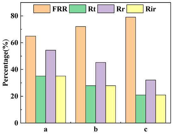 Flux recovery rate (FRR), proportion of total fouling (Rt), proportion of irreversible fouling (Rir) and proportion of reversible fouling (Rr) in the different ultrafiltration membranes after cyclic filtration. (a) The PVDF ultrafiltration membrane, (b) the C60(OH)n/PVDA ultrafiltration membrane and (c) the C60(OH)n-Ag/PVDF ultrafiltration membrane.