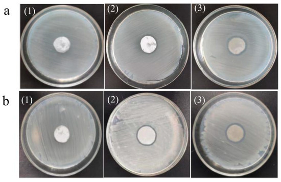 Bacteriostatic effects of the different ultrafiltration membranes on Escherichia coli (a) and Staphylococcus aureus (b). (1) The PVDF ultrafiltration membrane, (2) the C60(OH)n/PVDF ultrafiltration membrane, and (3) the C60(OH)n-Ag/PVDF ultrafiltration membrane.