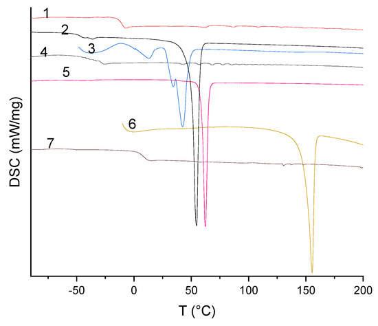 DSC thermograms for the poly(BnO-TEMC) homopolymer (1) and its copolymers with ε-CL and L-LA: (2) at a ratio of 10:1 for (ε-CL):(4), (3) at a ratio of 5:1 for (ε-CL):(4), (4) at a ratio of 1:1 for (ε-CL):(4), (5) poly(ε-CL), (6) poly-L-LA, and (7) at a ratio of 1:1 for (L-LA):(4). Scanning using a DSC 204 F1 (Netzsch, Germany) at a heating rate 10 °C/min in the temperature range from −100 to 200 °C under an inert atmosphere with an argon flow rate 60 mL/min in aluminum crucibles.