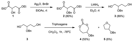 The novel carbonate 4 was synthesized according to Scheme 1 from previously prepared diol via the cyclization of racemic diol 3 [31], with 0.5 equiv. of triphosgene and 6 equiv. of pyridine in CH2Cl2 at –78 °C. The residue was purified via column chromatography on silica gel (the eluent was as follows: EtOAc:PE, 1: 1; Rf(4) = 0.7 and Rf(5) = 0.2) to yield the novel carbonate 4 (55%) as a colorless oil and 5 (6%) as a yellowish oil. The fact that carbonate 4 was isolated by means of column chromatography demonstrates the sufficient stability of the resulting carbonate. The by-product tetrahydrofuran 5 can be formed at the stage of acylation of alcohol 3 with triphosgene, as this reaction can then proceed in two different ways: in the case of 7-exo-trig cyclization, the desired carbonate 4 is obtained, while the closure of the 5-exo-tet ring via an SN2 reaction leads to the formation of tetrahydrofuran 5. The formation of a similar by-product has also been observed previously [32]. Maintaining the temperature regime of this reaction is extremely important. When the reaction is carried out at room temperature, compound 5 (3-benzyloxy-tetrahydrofuran) can be produced in a sufficient amount. Diol 3 was prepared from commercially available diethyl (±)-malate in two steps: O-benzylation of 1 by BnBr in the presence of Ag2O in EtOAc at r.t. and then a lithium aluminum hydride reduction of 2 in Et2O for 24 h. at r.t. (Scheme 1) [31].
