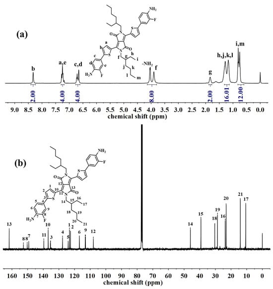 As outlined in Scheme 1, the synthesis of DPPTENFPDA is accomplished by a three-stage procedure. The structures of DPPTENFPDA and the corresponding intermediate monomers were verified via NMR (Figure 1, Figure S2 and Figure S3), MS analysis (Figures S4–S6), FTIR (Figure S7), and elemental analyses. The analytical findings validate the successful synthesis of DPPTENFPDA, DPPTENBr, and DPPTEN.