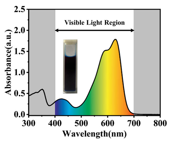 UV-Vis absorption spectrums of DPPTENFPDA in a DMF solution (the colored area indicates visible-light absorption. Inset: Photograph of a 5 μM DPPTENFPDA solution in DMF).