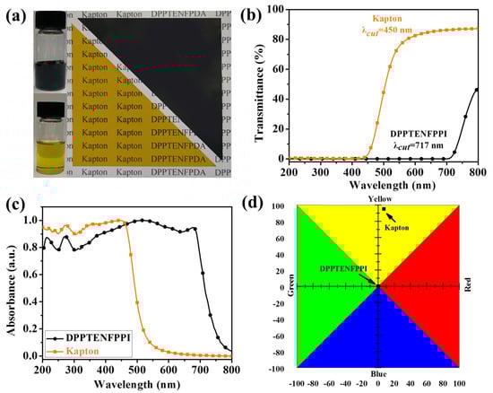 (a) The photo images of PAA solutions and PI films with a thickness of 20 μm (DPPTENFPPI (black); Kapton (yellow)); (b) transmission and (c) absorption UV−vis spectra for DPPTENFPPI and Kapton films; (d) CIE lab color parameters.