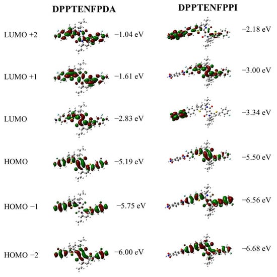 The frontier molecular orbitals (FMOs) of both the DPPTENFPDA and DPPTENFPPI units were analyzed with the Gaussian 09 (Revision D.01) software [14,23]. Visual representations of the FMO distribution are presented in Figure 4. In the case of DPPTENFPDA, the FMOs are extensively dispersed across the entire molecular framework. Conversely, within the DPPTENFPPI unit, the HOMOs and LUMO + 1 orbitals are predominantly assigned to the diamines, while the LUMO and LUMO + 2 orbitals are prominently distributed within the dianhydrides. The FMOs of the DPPTENFPPI demonstrate a reduced energy level compared to those of the DPPTENFPDA, which can be explained by the electron-accepting action of imide [24].