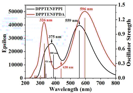 UV-Vis absorption spectra of the DPPTENFPDA and DPPTENFPPI units as predicted by the TD-DFT method, with oscillator strengths marked by vertical lines.