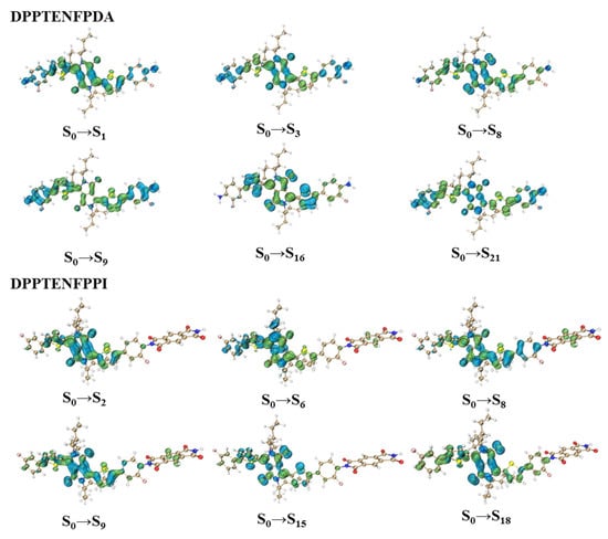 To better understand the characteristics of electron transition, the hole–electron distribution was studied using the Multiwfn (3.8 dev bin Win64) software [30]. Figure 6 illustrates the hole and electron distributions for the S0 → Si transitions in DPPTENFPDA and DPPTENFPPI. The green and blue isosurfaces stand for the distributions of electrons and holes, respectively. The high blackness of DPPTENFPPI is primarily due to its strong visible absorption, which is predominantly attributable to the transition of S0 to S2. In this S0 → S2 transition for DPPTENFPPI, the electrons and holes are distributed across the chromophore, with a particular concentration on the TDPP segment, as depicted in Figure 6. Similarly, the absorption in the visible spectrum of DPPTENFPDA is mainly derived from the transition of S0 to S1, which exhibits charge migration features akin to those in the S0 → S2 transition of DPPTENFPPI. Both transitions, the S0 to S1 in DPPTENFPDA and S0 to S2 in DPPTENFPPI, are related to the π−π* transitions, mainly owing to localized excitation [31,32]. To sum up, the theoretical analysis indicates that the profound darkness of DPPTENFPPI is largely owing to the HOMO → LUMO + 1 transition within the chromophore moiety.