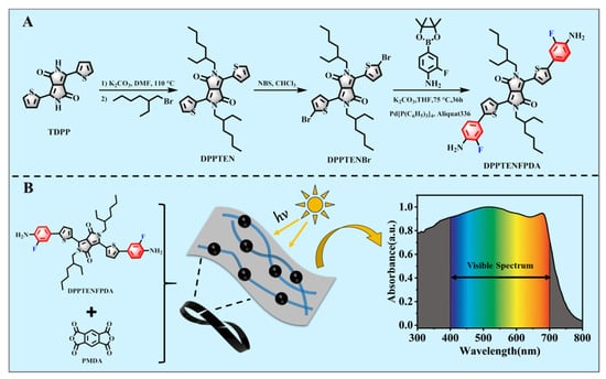 TDPP, potassium carbonate, 2-ethylhexyl bromide, N-bromosuccinimide, magnesium sulfate (MgSO4), 4-amino-3-fluorophenylboronic acid pinacol ester, Aliquat 336, Pd[P(C6H5)3]4, PMDA, and ODA were obtained from Alfa-Aesar. Before usage, the PMDA was vacuum-heated for six hours at 110 °C. Dichloromethane, tetrahydrofuran (THF), n-hexane, 1-methyl-2-pyrrolidinone (NMP), ethyl acetate, chloroform, and N,N-dimethylformamide (DMF) were obtained from the Sinopharm Chemical Reagent Company (Shanghai, China). These reagents were utilized as supplied, with no additional purification.