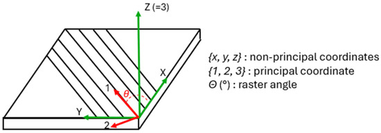 Two right-handed coordinate systems are normally considered: the first one, indicated as in Figure 1, is a convenience coordinate system that is often related to the external loading, while , , and are related to material symmetry. In particular, axes and coincide, while is rotated with respect to by the raster angle . Since a 3D-printed layer can be thought of as an orthotropic elastic material loaded in plane stress, four constants are necessary to represent its behavior, namely , , , and . and are Young’s moduli in the longitudinal and transverse directions, and is the in-plane shear modulus, while is Poisson’s ratio. Concerning strength, it is assumed that only the three independent material constants , , and describe the mechanical behavior and these are longitudinal, transverse, and shear strengths, respectively.