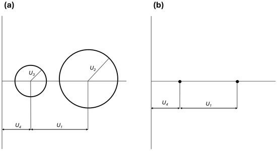 This representation is convenient to evaluate graphically and qualitatively the degree of anisotropy of the in-plane stiffness. In fact, if the material is strongly anisotropic, the two circles will appear large with respect to their distance (Figure 2a). On the other hand, if the material is isotropic, and ; thus, the circles will collapse to single points, and their distance is the only significant quantity (Figure 2b).