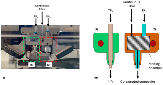 All specimens were printed using a Composer A3 by Anisoprint. The printhead is equipped with two different extruders (Figure 3): The left one is a standard Bowden device with a 0.4 mm nozzle and receives the ordinary thermoplastic filament TP1. The right one is input with the continuous reinforcement fiber and another thermoplastic filament, TP2, that is molten within a melting chamber and co-extruded with the fiber through a 0.6 mm nozzle.