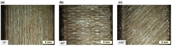 Notice that while CFCPA is an unreinforced thermoplastic, both SMPA and CBFcc are composites: they differ by the material of the reinforcing fibers (carbon for SMPA, basalt for CBFcc) and by the fiber length (short fiber for SMPA and continuous fibers for CBFcc). This peculiarity is well described in Figure 5. Figure 6 shows the fiber orientation for CBFcc, for the three raster angle orientations. It is possible to observe fiber bending at the edges, especially for 90° and ±45°.