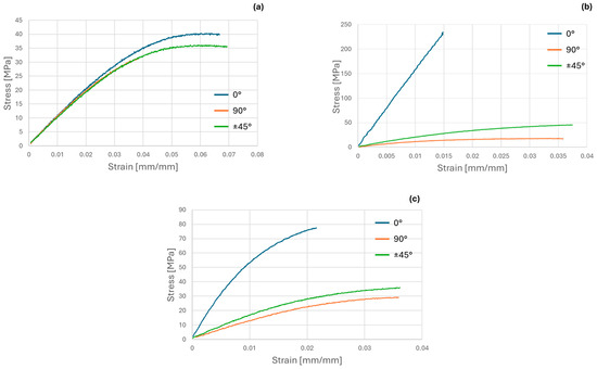 For CBFcc, the development of the curves is completely different (Figure 8b). The 0° curve has significantly higher stiffness and strength than 90° and ±45°; therefore, this material has a markedly anisotropic behavior. Moreover, the material is brittle in the longitudinal direction while it is ductile in the other two.
