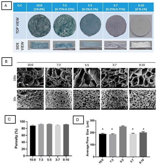 Morphological and Structural Characterization of Gelatin–Carrageenan (G-C) Scaffolds. (A) Top and side views of scaffolds with varying G-C ratios (10:0, 7:3, 5:5, 3:7, 0:10), showing genipin-induced blue intensity. (B) SEM images (100×, 30×) illustrating scaffold pore structure. (C) Porosity (%) across all groups remains consistent at 80–85%. (D) Average pore size (µm) (* p < 0.05).