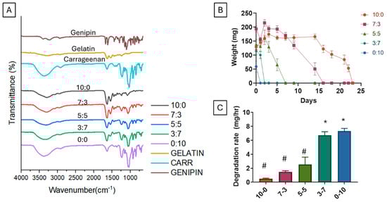 FTIR, Hydrolytic Degradation, and Degradation Rate of G-C Scaffolds. (A) FTIR spectra of gelatin, carrageenan, genipin, and scaffold compositions (10:0 to 0:10), highlighting amide and sulfate peaks. (B) Hydrolytic degradation over 25 days, with 10:0 showing the slowest and 0:10 the fastest degradation. (C) Degradation rates, with 3:7 and 0:10 showing significantly higher rates (* p < 0.05 vs. 10:0, # p < 0.05 vs. 0:10).