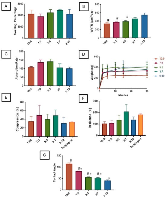 Physicochemical and Mechanical Properties of Gelatin–Carrageenan Scaffolds with Varying Compositions. (A) Swelling percentage of scaffolds showing consistent swelling behavior across all groups. (B) WVTR, showing reduced permeability in high-gelatin scaffolds (p < 0.05 vs. 0:10). (C) Water absorption rate of scaffolds indicating similar rates among compositions. (D) Water absorption weight after 30 min. (E) Compression capacity comparable to Surgispon. (F) Resilience percentage reflecting the scaffold’s elasticity, showing comparable resilience to commercial Surgispon. (G) Contact angle measurements, indicating greater hydrophilicity with more carrageenan (* p < 0.05 vs. 10:0, # p < 0.05 vs. 10:0).
